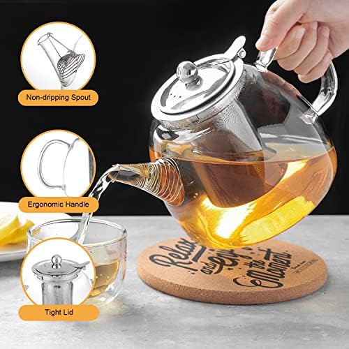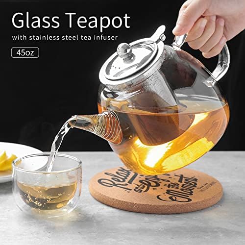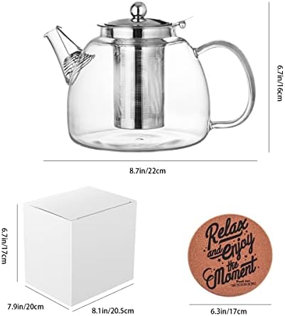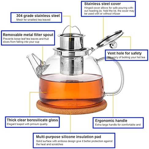 Premium Materia: The glass teapot is handcrafted from extra thick borosilicate glass and food grade 304 stainless steel, the cystal clear glass teapot is heat-resistant, making it stovetop and microwave safe. Generous 45oz/1350ml capacity is enough for everyday use or party serving. All components of the glass teapot can be washed in the dishwasher, making tea hosting a breeze. (Note: Pls remove the the infuser & strainer first).