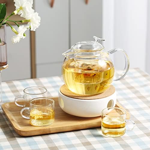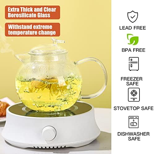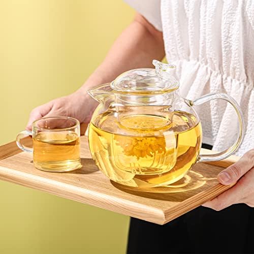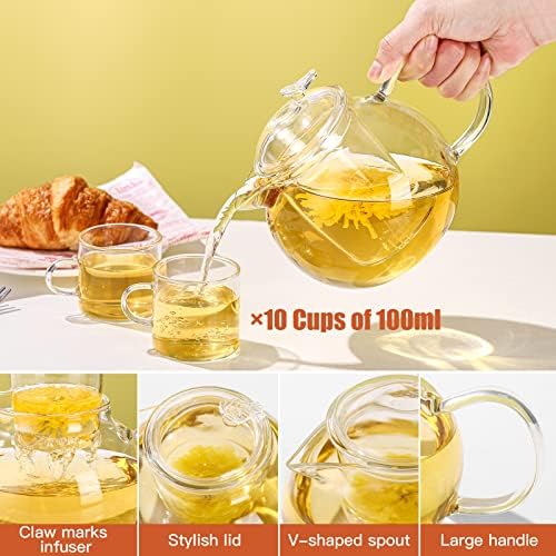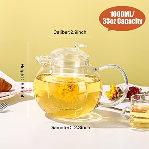 【EXCEPTIONAL QUALITY】All part of this teapot is completely hand crafted, made from heat resistant borosilicate glass, specially designed with V-shaped spout for even pouring and extra-wide handle for sturdy grip.1000ml/33oz capacity, which brews 4-5 cups plenty to share. It’s a great tea pots for tea party.
