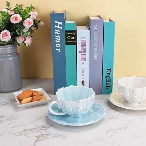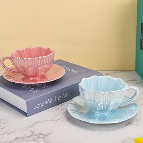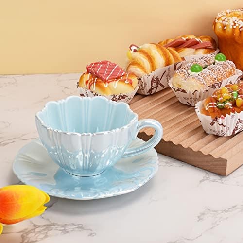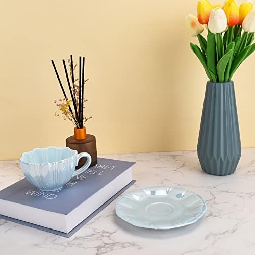 Koythin Ceramic Coffee Mug, Creative Cute Cup with Flower Shape Saucer, Novelty Coffee Cup with Comfortable Grip for Office and Home, 8.5 oz/250 ml for Tea Latte Milk (Light Blue)