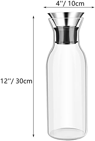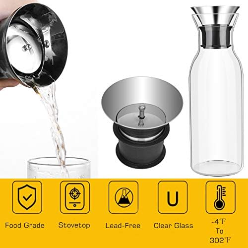 304 STAINLESS STEEL DRIP FEE LID :This glass carafe has a drip-free spill proof bottle pourer, opens automatically when you pour, This means that you avoid the fridge aftertaste or ice cubes splashing down into the tumbler, The lid is composed by a round stainless top cover, a silicone bottom lid and a stainless stem that holds both items together.
