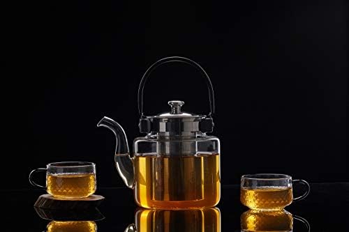 About Design: The sturdy 18/8 stainless steel tea Infuser will filter your tea. It’s easy to remove and washable. To avoid overheating the handle, ergonomic fold-down handle design on the top of the teapot. Specially designed spout for effortless pouring, don’t have to worry about boiling water coming out of the spout.Larger Capacity: Bigger pot for more tea. 40 oz(1200ml) teapot is large enough for serving 3-5 people, perfect for families and tea parties.About Quality: This teapot kettle is made with high quality borosilicate glass. Heat-resistance 0 to 300 ℉. The tea pot is stovetop safe, dishwasher safe. You can put it directly on gas or electric stove tops with a medium level heat to heat water to brewing.Gift for tea lover: Beautiful design, practical function. This pretty clear teapot is a perfect gift for tea lovers making all kinds of tea and drinks like herbal tea, black tea, flower tea, fruit tea, lemonade, coffee, etc.