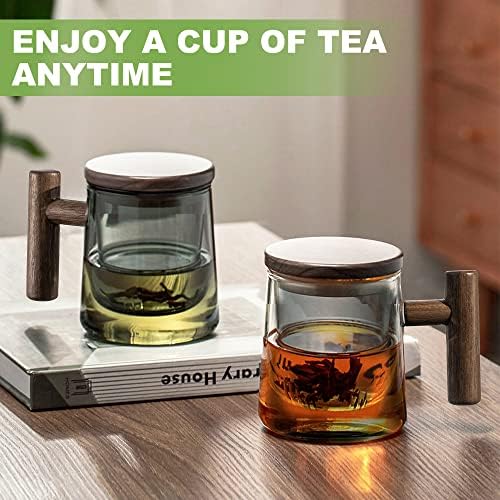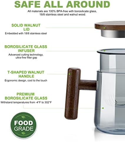 ♨ Tea Mug – We want more tea lovers to enjoy filtered tea anytime and anywhere, so we designed this three-piece split glass tea mug. Both the lid and the handle are made of heat-resistant and non-slip solid walnut wood, and the ergonomic T-shaped design brings a comfortable grip experience. The lid is embedded with 18/8 stainless steel, which is more durable and not easy to mildew. Also the lid can be coaster for the infuser and keep your tea warmer.