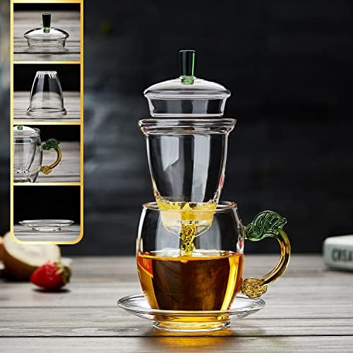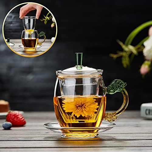 【☕FUNCTIONAL DETAIL DESIGN】: Our tea cup with infuser and lid has a full and beautiful overall shape. The lid has a green handle for easy access. Glass infuser with fine mesh, which can effectively filter tea leaves. Delicate yellow and green handle for a comfortable grip. Glass saucer, when you need to drink the tea after brewing, you can take out the infuser and place it on the saucer, which is hygienic and prevents water from soaking your desktop, which is convenient and practical.