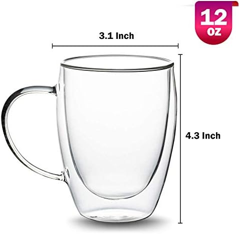 Borosilicate Double Walled Glasses 12oz: Our large insulated coffee cups they’re not just elegant and fancy, they are resistant, and that is because is made with borosilicate glass which is more durable than normal glass and is well known as the purest and safest material so this makes the 2 layers a fresh look in our clear glass coffee mugs The temperatur of your drink will remain for long time in this clear coffee cups.