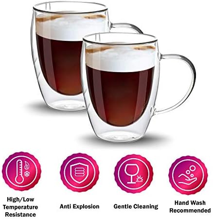 Elegant insulated cup Design: Our clear coffee mug, is designed with a double-walled, to look sophisticated, elegant and overall that your coffee, tea, expresso, cappuccino, chocolate always keep the temperature, thanks to quality material like the borosilicate, that make our coffee mug is insulated, supporting low and high temperatures. So you will enjoy with our a tea cup a hotter and colder drink meanwhile see the double-wall effect of floating beverage each time.